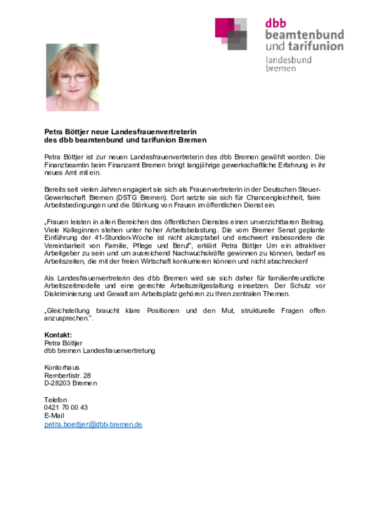 Aktuelles 24. Februar 2026 Auf Facebook teilenAuf X weitersagenArtikel versendenWahl der Frauenvertretung des dbb landesbund bremenPetra Böttjer von der DSTG wurde am 18.02.2026 gewählt